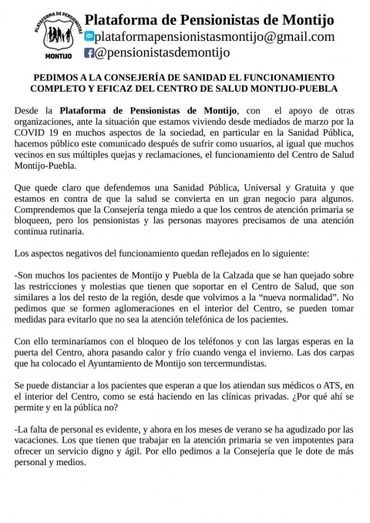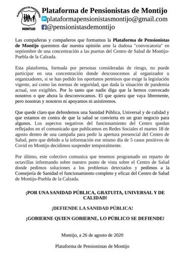 "Las compañeras y compañeros que formamos la Plataforma de Pensionistas de Montijo queremos dar nuestra opinión ante la dudosa "convocatoria" en septiembre de una concentración a las puertas del Centro de Salud de Montijo-Puebla de la Calzada.