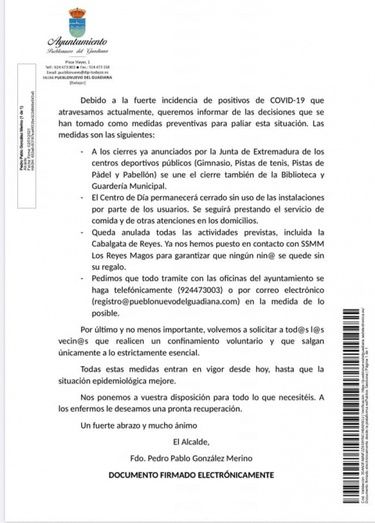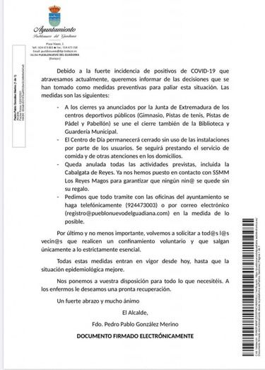 Guadiana colgaba en su web y redes sociales un comunicado el día 2 de enero en el que ya daba cuenta de que ante el aumento de casos acumulados, procedían al cierre del Centro de Día, pistas de pádel, guardería municipal y otras instalaciones, tal y como proponía la Junta de Extremadura, y la cancelación de las actividades formativas y deportivas, así como la visita de los Reyes Magos y cualquier otra actividad lúdica programada.