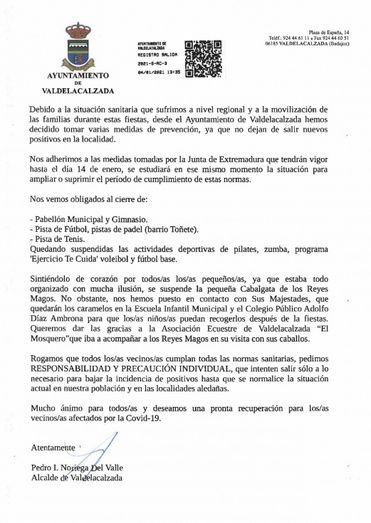 En Valdelacalzada publicaban una nota en la que comunicaban que se adherían a las medidas tomadas por la Junta y que tendrán vigor hasta el 14 de enero revisable: cierre del Pabellón y Gimnasio Municipal, pistas de fútbol, pádel y tenis, suspensión de las actividades deportivas y la Cabalgata de los Reyes Magos.”
