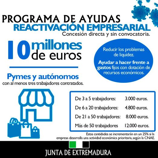La Junta de Extremadura pone en marcha el Decreto-Ley 15/2020, de 29 de diciembre, que incluye un nuevo programa de ayudas, de concesión directa y sin convocatoria, con el objetivo de reducir los problemas de liquidez de pymes y autónomos afectados por la crisis sanitaria y ayudarles a hacer frente a sus gastos fijos, dotándoles de recursos económicos. De esta manera hasta 10 millones de euros irán a paliar la situación de las empresas y autónomos así como contribuir al mantenimiento del empleo.