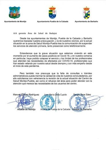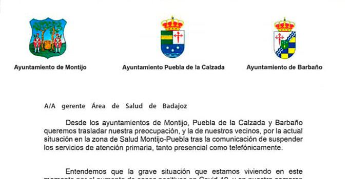 Los alcaldes de Montijo, Puebla de la Calzada y Barbaño han mantenido una reunión telemática de la que se concluyó escribir un escrito al Área de Salud solicitando refuerzos de personal en el Centro de Salud mientras dure la situación de gravedad de la alerta sanitaria en la zona atendida para poder dar cobertura sanitaria y administrativa tal y como precisan los vecinos de la zona.
