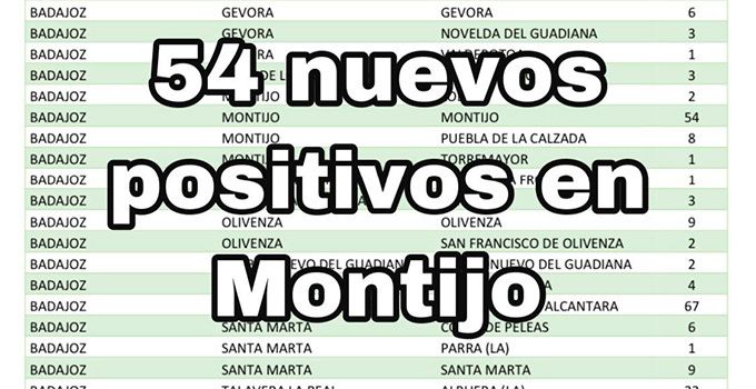 54 nuevos positivos en Montijo harían 847 positivos acumulados en el municipio a falta de conocer los datos de las altas entre los afectados (datos de los desconocemos cifras desde el 15 de enero, fecha en que se anunciaron 139 altas).