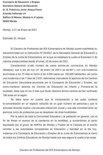 Por su parte, el Claustro de Profesores del IES Extremadura quiso sumarse a estea petición de las AMPAS y emitieron una misiva el jueves noche también dirigida a Francisco Javier Amaya, Secretario General de Educación, en el que mostraban su disconformidad con la Instrucción que establecía la vuelta al Escenario II de máxima presencialidad para este lunes y señalaban que estimaban "impruedente la apertura de los centros de Educación Secundaria anunciada por la Consejería de Educación y Empleo, así como mantener abiertos los Centros de Educación Infantil y Primaria"