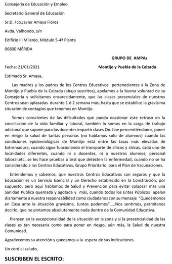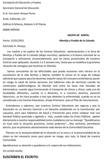 Según pudo saber Crónicas de un Pueblo, desde este grupo de AMPAS se preparó un escrito conjunto dirigido al Secretario General de Educación solicitando el aplazamiento de la vuelta al colegio de forma presencial atendiendo a las condiciones epidemiológicas y sanitarias que vive Montijo en estos momentos que, posteriormente, fue remitido a este medio.