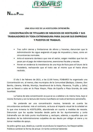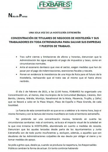 La Federación de Asociaciones de Bares y Restaurantes de Extremadura, Fexbares, está organizando una concentración en varios de los grandes municipios de la región para protestar sobre su situación.