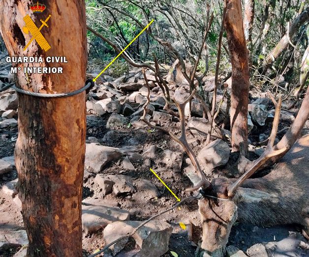 En uno de estos lazos, se hallaba atrapado un ciervo que ya había perdido su vida y del que supuestamente tan solo aprovecharía como trofeo su cornamenta.