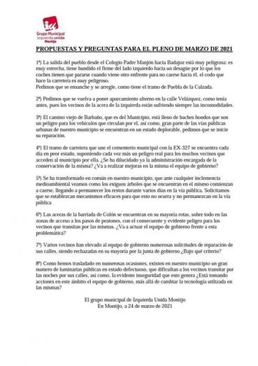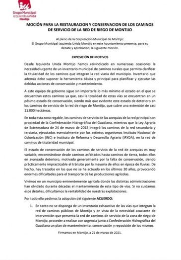 En la exposición de motivos se puede leer que "Desde Izquierda Unida Montijo hemos reivindicado en numerosas ocasiones la necesidad urgente de un inventario municipal de caminos rurales que permita clarificar la titularidad de los caminos que integran la red viaria del municipio. Inventario que adema?s debe suponer la herramienta ba?sica y principal para planificar y ejecutar las debidas acciones de conservacio?n y mantenimiento.