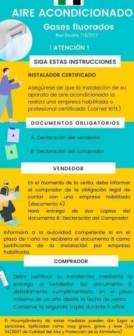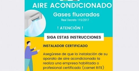 Según el Real Decreto sobre gases fluorados (Decreto 115-2017), los aparatos o equipos precargados de refrigeración, aire acondicionado y bombas de calor que no estén herméticamente sellados y que estén cargados con gases fluorados de efecto invernadero, sólo podrán venderse al usuario final cuando se aporten pruebas de que la instalación será realizada por una empresa habilitada.