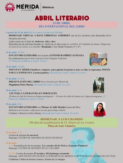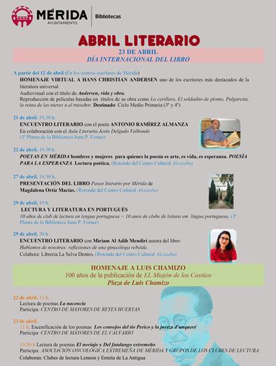 Al día siguiente, 22 de abril, en la Rotonda del Centro Cultural Alcazaba, a las 19.30 horas se celebrará la actividad Poetas en Mérida, poesía para la esperanza,“un recuerdo a estos hombres y mujeres para quienes la poesía es arte, es vida, es esperanza”.