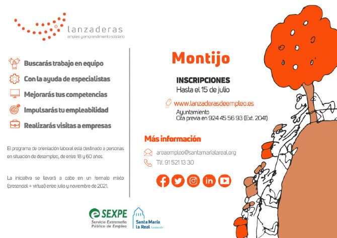 La nueva Lanzadera de Empleo de Montijo comenzará a funcionar a mediados de julio y estará operativa hasta mediados de noviembre, ofreciendo de forma gratuita orientación laboral, acompañamiento y asesoramiento a 20 hombres y mujeres en situación de desempleo, con edades comprendidas entre los 18 y los 60 años. Pueden tener cualquier nivel de estudios (ESO, Formación Profesional, Bachillerato, Universidad, Master, etc.) y proceder de cualquier sector profesional, con o sin experiencia previa.