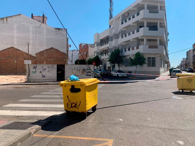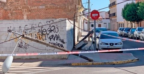 La esquina de la calle Clavijo en cruce con Navas de Tolosa está temporalmente cortada al tráfico al haberse vencido dos postes de madera que sujetaban los cables de luz y fibra óptica así como una farola.