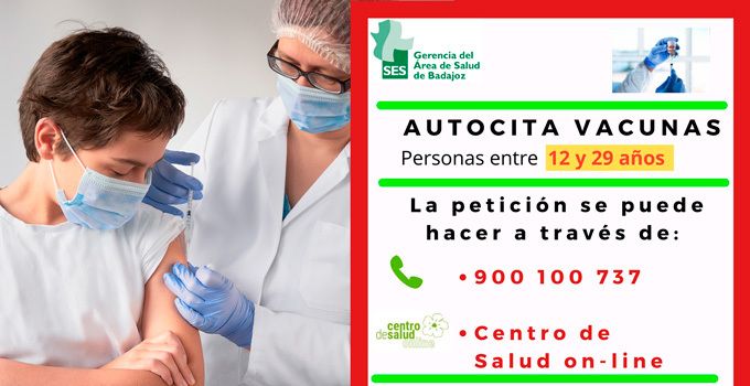 De este modo, será la población de 12 a 29 años los que pueden solicitar su cita para recibir la vacuna contra el Covid19 llamando al teléfono 900 100 737 o en la web de Salud Pública , Centro de Salud Online (https://saludextremadura.ses.es/csonline/).
