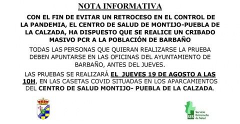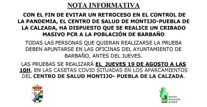 El Ayuntamiento de Barbaño hace pública una nota informativa en la que señala que "con el fin de evitar un retroceso en el control de la pandemia, el Centro de Salud de Montijo-Puebla de la Calzada, ha dispuesto que se realice un cribado masivo PCR a la población de Barbaño.
