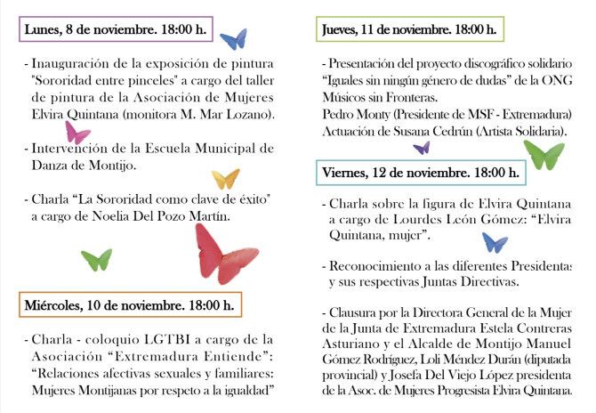 - Charla-coloquio LGTBI a cargo de la Asociación "Extremadura Entiende": "Relaciones afectiva sexuales y familiares: Mujeres Montijanas por respeto a la igualdad".