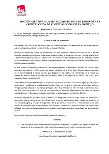 Izquierda Unida vuelve a poner sobre la mesa del Pleno la construcción de viviendas sociales en Montijo