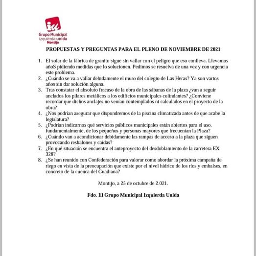 Izquierda Unida Montijo presentará dos mociones a debatir en el Pleno Ordinario de noviembre.