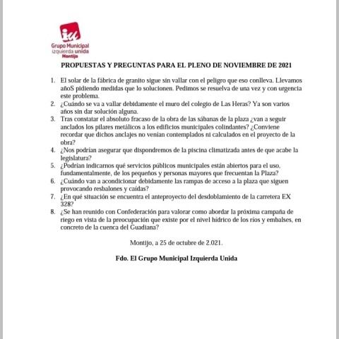 Entre las propuestas y preguntas que el grupo realizará al grupo de gobierno, se tratará el de la apertura de la Piscina Climatizada, el vallado del solar de la fábrica de granito y del muro del colegio de Las Heras o la situación actual del proyecto de desdoblamiento de la EX32, entre otros.