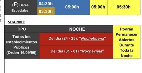 De este modo, los viernes, sábados y vísperas de festivos desde el 10 de diciembre hasta el 6 de enero se amplían los horarios, en bares, cafés, restaurantes, discotecas, salas de baile, etc, con diferentes horarios en función del tipo de negocio, tal y como se especifica en el cuadro.