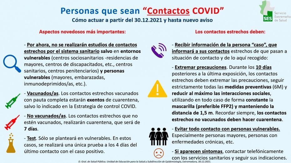 Como en el caso de los positivos, aquellas personas que sean contactos estrechos deben extremar las precauciones, seguir estrictamente las medidas preventivas indicadas hasta ahora (distancia social, uso de mascarilla…) y evitar el contacto con personas vulnerables.