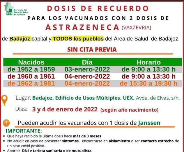 El área de Salud de Badajoz realiza vacunaciones sin cita previa durante los primeros días del año para los vacunados con 2 dosis de Astrazeneca (Vaxzervria) y los vacunados con 1 dósis de Janssen de todos los pueblos del Área de Salud.