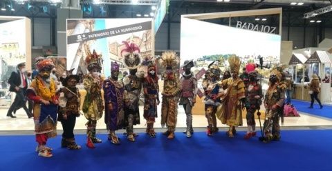 Miembros de las comparsas Vas Como Quieres, Montihuakán, y La Kochera, han estado en Madrid promocionando Extremadura y el Carnaval de Badajoz en el stand de la ciudad, en Fitur.
