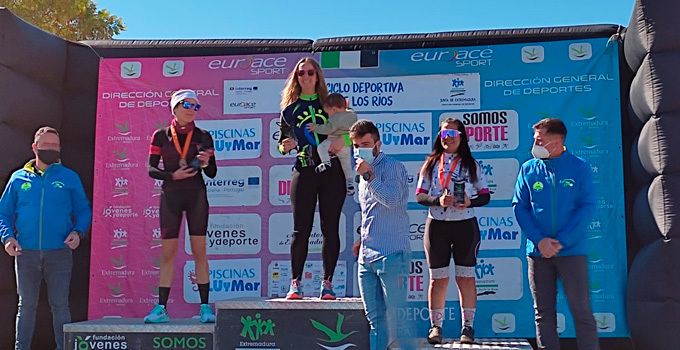 Se viene también de Miajadas con medalla Guadalupe Sánchez Barrena que subÃa al podio acompañada de su bebé para recoger el oro. Guadalupe, del Club Ciclista Puebla, disputaba el Ciclo Femenino en Ruta Corta, que finalizaba con un tiempo de 03:06:49, haciéndose con la primera posición en su categorÃa.