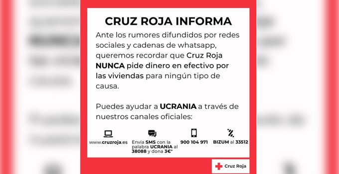 Cruz Roja sale del paso ante los rumores difundidos a través de redes sociales y cadenas de whatsapp y recuerda que la institución nunca pide dinero en efectivo por las viviendas para ningún tipo de causa.