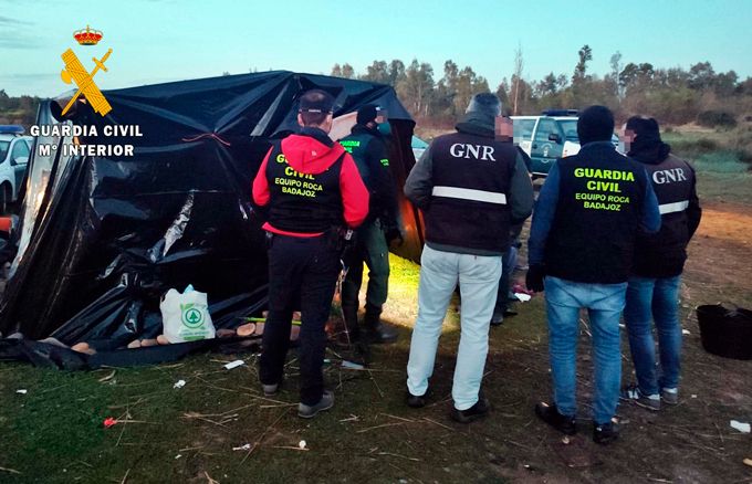 Con los dispositivos de servicios establecidos para la localización, vigilancia y movimientos de estas personas, los agentes pudieron ubicar en un asentamiento dentro del término municipal de Montijo, el lugar donde supuestamente se ocultaban los implicados en las acciones delictivas.