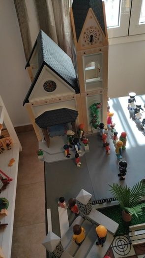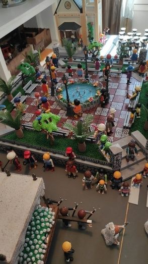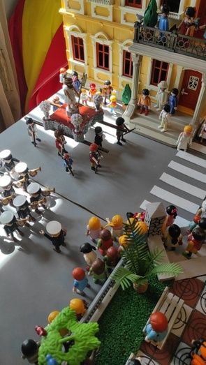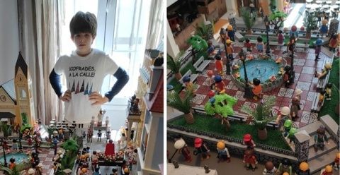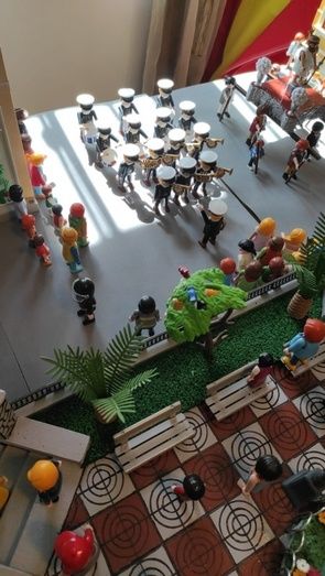 Aficionados y entusiastas del Playmobil, padre e hijo hicieron a pequeña escala una réplica de la procesión de Cristo Resucitado en Puebla de la Calzada. No faltaron detalles a una plaza de España que lucía las características baldosas en rojo y blanco de la plaza poblanchina, su fuente, cada una de las escaleras y pilares de la plaza, con el escudo del municipio, el Ayuntamiento, la Iglesia, la Casa de la Cultura, las mujeres vestidas de mantilla, la banda de música, la policía local distribuendo el tráfico… y traje blanco y, cómo no, los tres pasos tal cual salen en esta festividad, con los pasos y las flores que los acompañan, en una fiel representación.