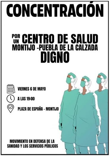 El Movimiento en Defensa de la Sanidad y los Servicios Públicos convoca de nuevo una concentración en la Plaza de España de Montijo en defensa de un Centro de Salud Montijo-Puebla de la Calzada digno para toda la comarca.