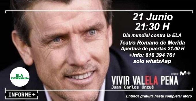 El 21 de junio, Día Mundial de la ELA, se conmemora en Extremadura con la presentación del documental “Vivir valELA pena”, protagonizada por Juan Carlos Unzué, portero y entrenador de fútbol, afectado por la enfermedad, que se proyecta por primera vez en abierto para toda España desde el Teatro Romano de Mérida.