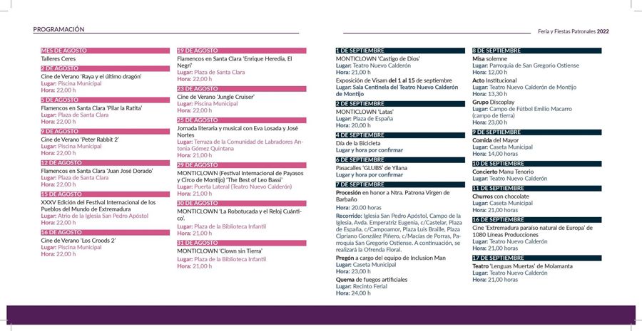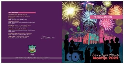Un programa de feria que recoge las actividades que se realizarán en agosto y septiembre y que cuenta con actividades variadas y dirigidas a todos los públicos, destacando Monticlown, que vuelve a traer risas y sonrisas a niños y mayores, Flamencos en Santa Clara, que trae hasta la Plaza de Santa Clara las actuaciones de renombrados artistas del flamenco, el tradicional Festival Internacional de los Pueblos del Mundo, y todas las actividades que recoge la feria: fuegos artificiales, acto institucional con entrega de distinciones, día de la bicicleta, ofrenda floral, concierto del Grupo Discoplay y la actuación de Manuel Tenorio en el Teatro Nuevo Calderón.