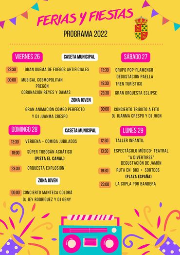 La programación terminará el lunes 29 con talleres infantiles desde las 12:30 horas, seguidos del espectáculo músico-teatral "A divertirse" y degustación de jamón a partir de las 13:30 horas. Por la tarde, en la Plaza de España, ruta en bici y sorteos. Y por la noche, terminará la fiesta con música, a partir de las 23:00 horas, con "La copla por bandera".