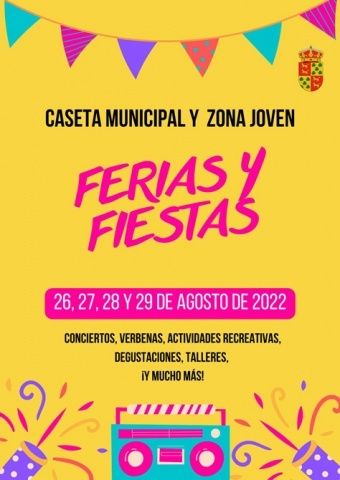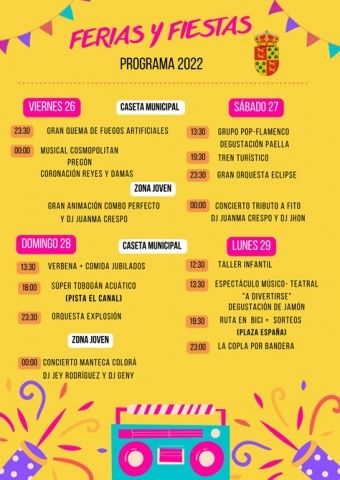 La programación comenzará el viernes, día 26, a las 23:00 horas, con una gran quema de fuegos artificiales. A partir de las 12:00 horas, en la Caseta Municipal, tendrá lugar el pregón de las fiestas, la coronación de Reyes y Damas y música con Musical Cosmopolitan. Mientras, en la Zona Joven, gran animación con Combo Perfecto y Dj Juanma Crespo.