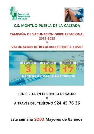 En el Centro de Salud de Montijo-Puebla de la Calzada darán comienzo las vacunaciones en el propio centro con la entrada del mes de octubre y de forma ordenada por criterio de edad.