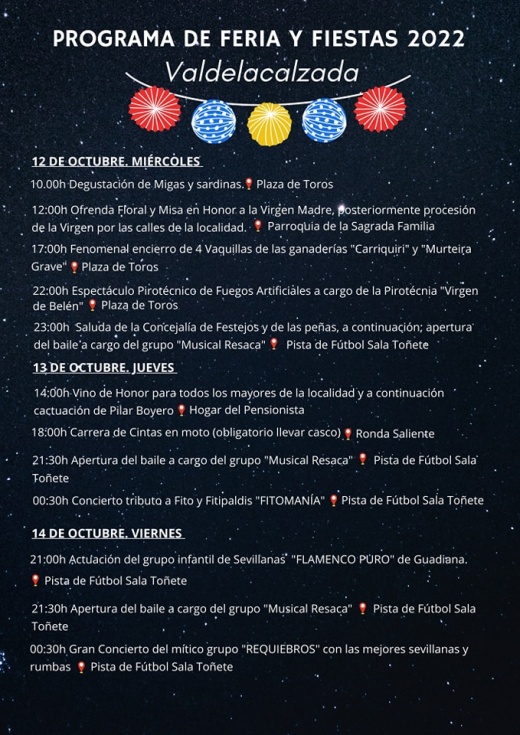 El 12 de octubre se da el pistoletazo de salida a la feria y fiestas de Valdelacalzada, para ello, el Ayuntamiento ha organizado un programa con actividades para todos, mayores y pequeños, variadas y diversas.