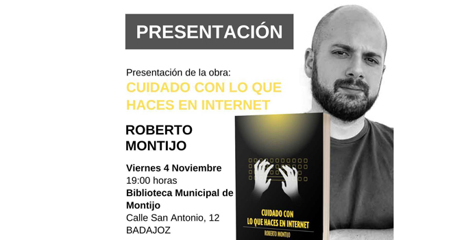El próximo viernes 4 de noviembre a partir de las 19:00 horas, la Biblioteca Municipal de Montijo acoge la presentación de la novela ‘Cuidado con lo que haces en Internet’, el estreno en el mundo de la literatura del periodista y escritor montijano Roberto Rodríguez, que firma bajo el seudónimo de Roberto Montijo.