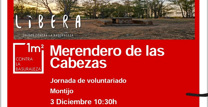 Cruz Roja Vegas Bajas junto al Proyecto Libera organiza el 3 de diciembre una recogida de residuos en el entorno del Merendero Municipal de "Las Cabezas". Ese día todas las personas que quieran participar solo tienen que apuntarse en las instalaciones de Cruz Roja o bien presentarse ese mismo día a las 10:30 h. en la sede para salir desde allí todos juntos hacia "Las Cabezas".