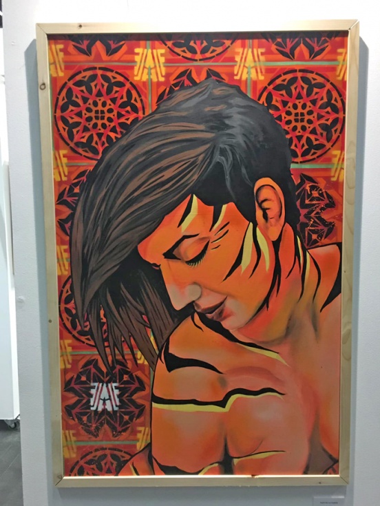 Álex, fiel a su inseparable spray, muestra en Animala, una obra de 110x90 centímetros enmarcada en madera vista, precisamente cómo se trabaja con este tipo de técnica; spray y acrílico sobre tabla.