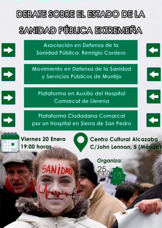 Además, el Movimiento en Defensa de la Sanidad y los Servicios Públicos junto a otras plataformas y asociaciones regionales, participan el viernes 20 de enero en el Centro Cultural Alcazaba, en Mérida, en el "Debate sobre el estado de la Sanidad Pública extremeña" organizado por la Asociación 25 de Marzo.