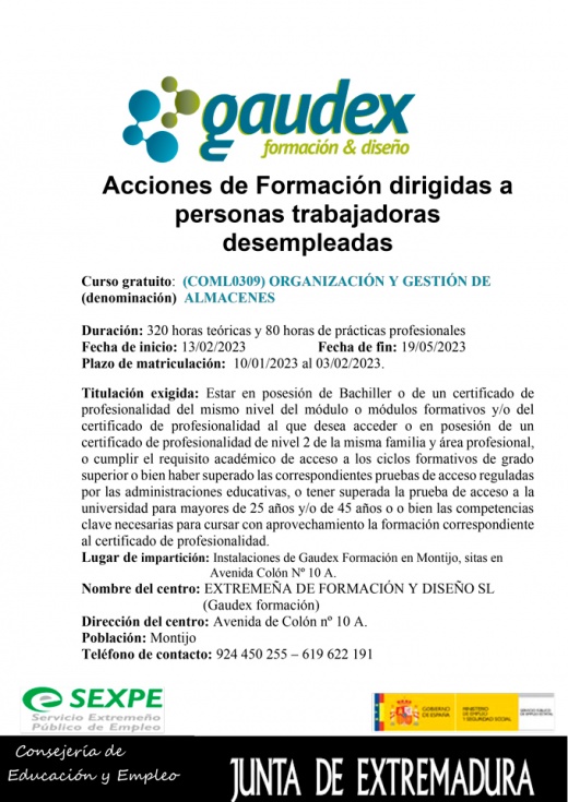 El curso, que se impartirá en las instalaciones de Gaudex Extremeña de Formación y Diseño en la Avenida de Colón10 A, tendrá una duración de 320 horas teóricas y 80 de prácticas profesionales, y dará inicio el 13 de febrero, terminando el 19 de mayo.