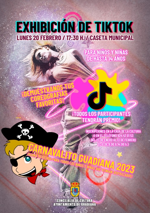 En cuanto a la Exhibición de TikTok que se celebrará en la Caseta Municipal el lunes del Carnavalito, podrán participar niños y niñas de hasta 14 años y habrá premio para todos los participantes. Quienes deseen inscribirse pueden pedir a sus padres que les apunten en la Casa de la Cultura directamente o llamando al teléfono 924 47 01 53. El plazo para inscribirse en esta Exhibición de TikTok será del 23 de enero al 13 de febrero.
