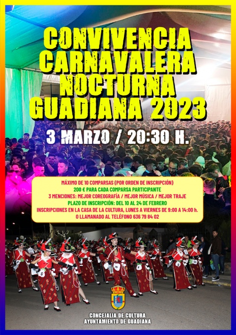 En lo referente a la Convivencia Carnavalera Nocturna, el plazo de inscripción será del 10 al 24 de febrero, también en la Casa de la Cultura o en el teléfono 636 79 84 02. Cada comparsa participante recibirá 200 € como gratificación y, además, habrá menciones a la Mejor Coreografía, Mejor Música y Mejor Traje.