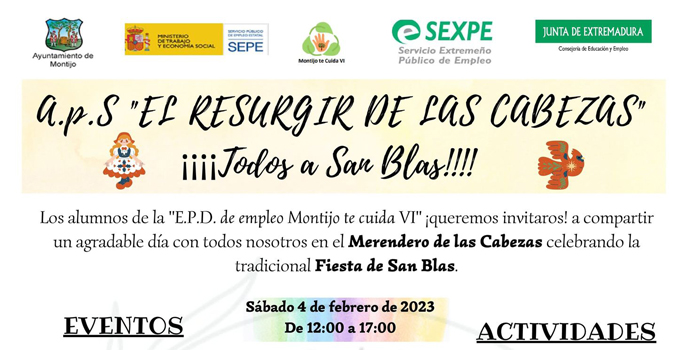 La organización de la celebración de esta fiesta tan tradicional en nuestra localidad en esta ocasión va a correr a cargo de los alumnos de la Escuela Profesional de empleo “Montijo te cuida VI a través del proyecto social “EL RESURGIR DE LAS CABEZAS” que pretende recuperar el merendero las cabezas para el uso y disfrute de toda la ciudadanía y concienciar a la población de la importancia del cuidado de nuestro entorno, es decir, disfrutar de él sin necesidad de ensuciarlo, destrozarlo o maltratarlo.
