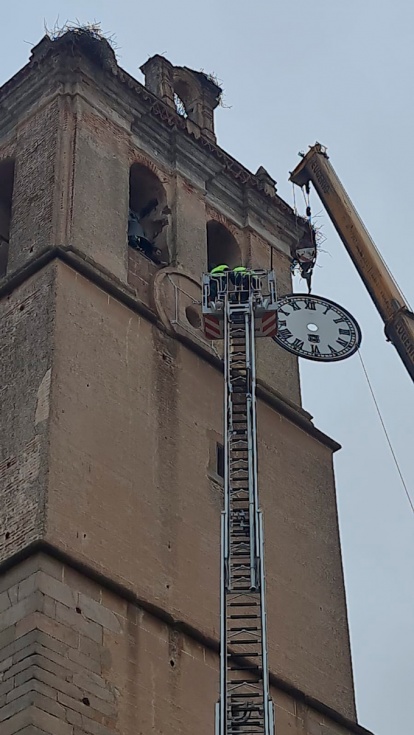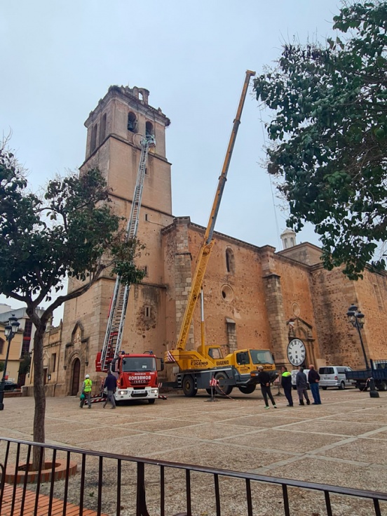 En la mañana del 24 de marzo, 5 meses después de la caída del reloj de la torre de la Iglesia de San Pedro Apóstol, en Montijo, debido al fuerte viento del huracán Béatrice, operarios con maquinaria en altura han procedido a la colocación del de un nuevo reloj contando con la colaboración de los bomberos de Puebla de la Calzada.