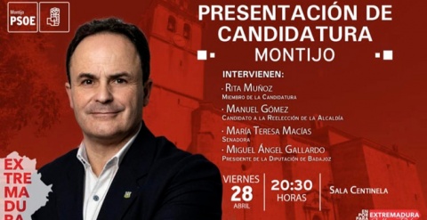 Hoy viernes 28 de abril, a las 20:30 horas, la Sala Centinela acoge la presentación de la candidatura a la alcaldía del PSOE en Montijo.