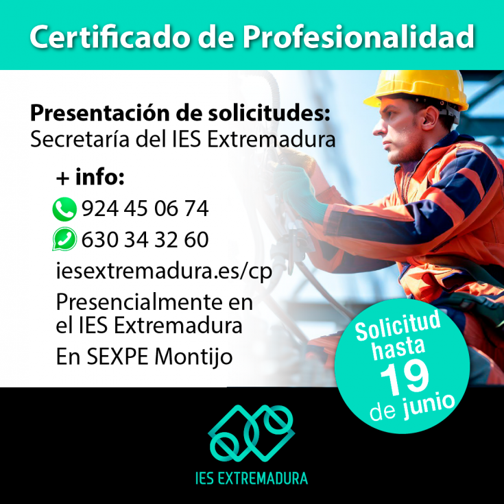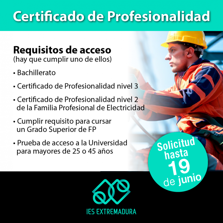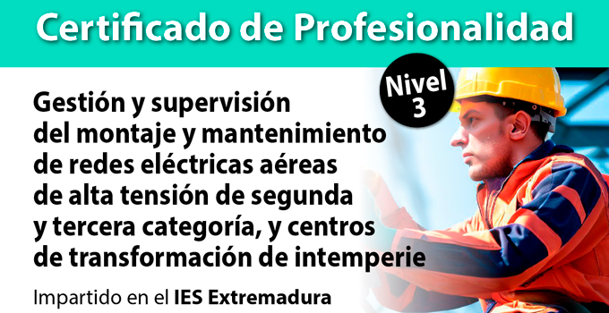 Hasta el 19 de junio está abierto el plazo de solicitud para cursar el Certificado de Profesionalidad de Nivel 3 de “Gestión y supervisión del montaje y mantenimiento de redes eléctricas aéreas de alta tensión de segunda y tercera categoría, y centros de transformación de intemperie”, que se impartirá en el IES Extremadura a partir de octubre, con 630 horas de formación, de las cuales, 80 serán prácticas en empresa.