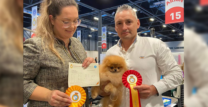 Antonio David Ortiz Martín y su perro Dylan, un Pomerania de un año, participaban por primera vez en Campeonatos de exposición caninos, de los que obtienen un excelente resultado.