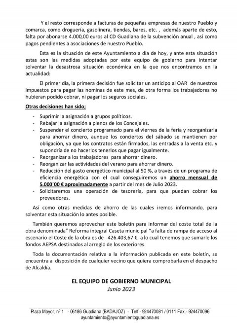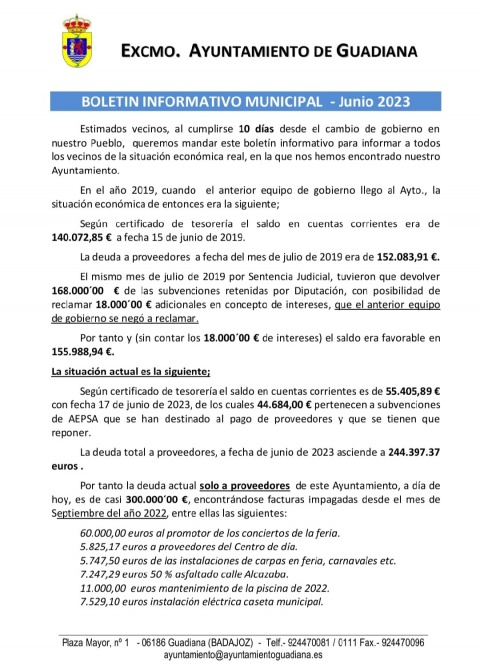 Tan solo 10 días después del traspaso de poder en el Ayuntamiento de Guadiana, el nuevo equipo de gobierno de Guadiana emitía un comunicado en el que informaba sobre “la situación económica real en la que nos hemos encontrado nuestro Ayuntamiento”.