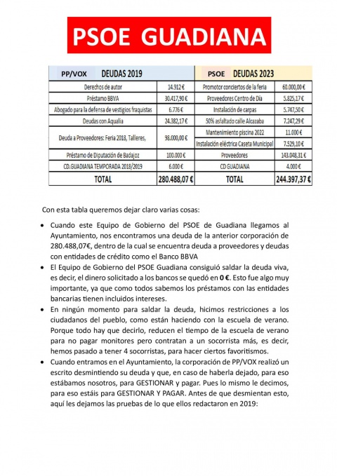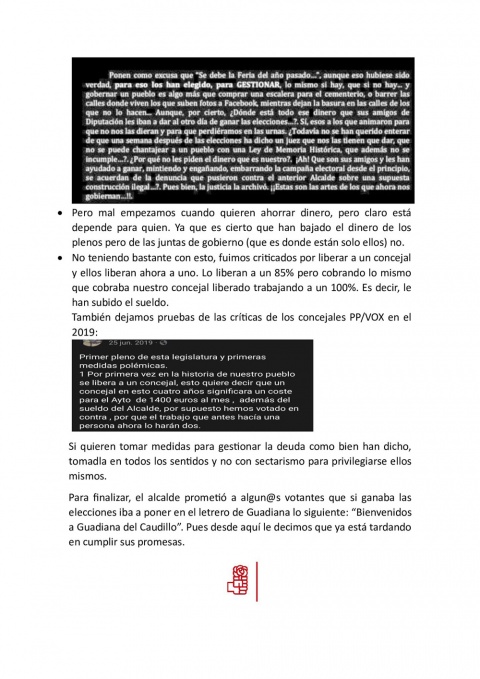 Finaliza el PSOE tachando al nuevo equipo de gobierno de tomar las medidas para gestionar la deuda de forma sectaria y le invita a cumplir su promesa electoral hecha a algunos votantes de volver a poner en el letrero de Guadiana “Bienvenidos a Guadiana del Caudillo”.